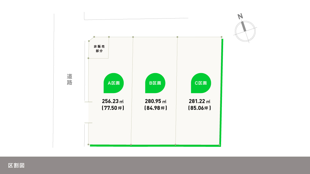 | 敷地面積 | A区画:256.98㎡ B区画:281.35㎡ C区画:281.57㎡ |